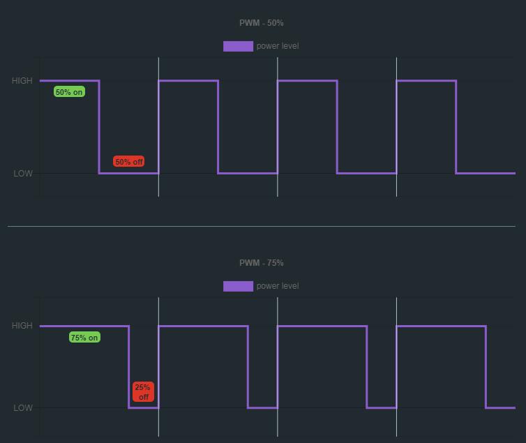 Take a look at the following two graphs showcasing two different duty cycles, one at 50% and one at 75%. The duty cycle of a PWM signal describes the amount of time it is turned on within a specific time-frame and is therefore roughly equivalent to the brightness of a connected LED.