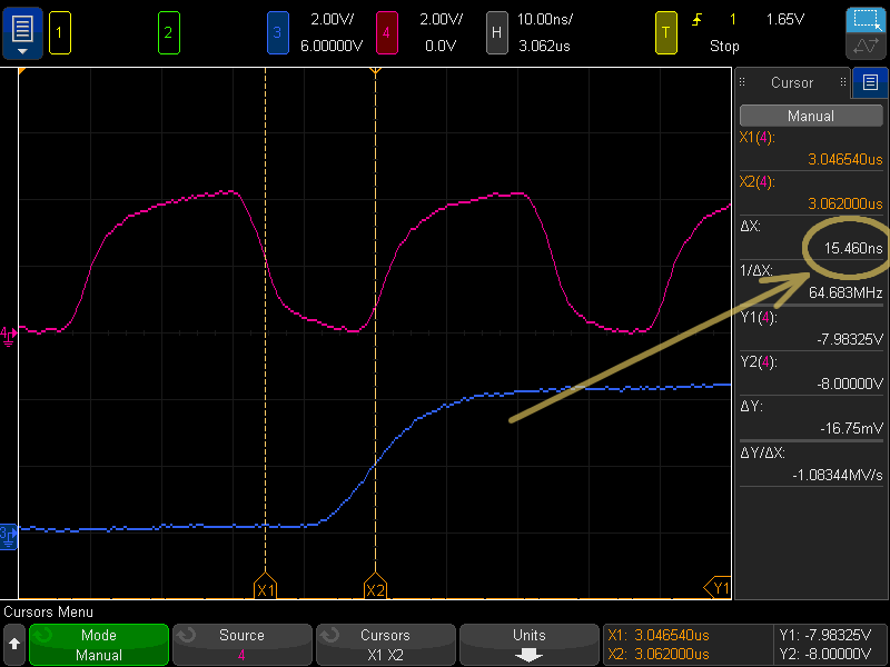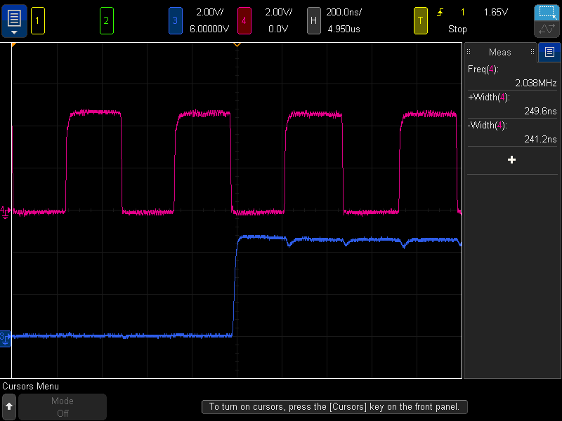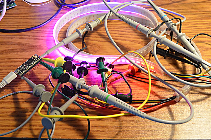After 144 LEDs, the clock low time on this strip has shrunk from 20.83 ns to approximately 18 ns.